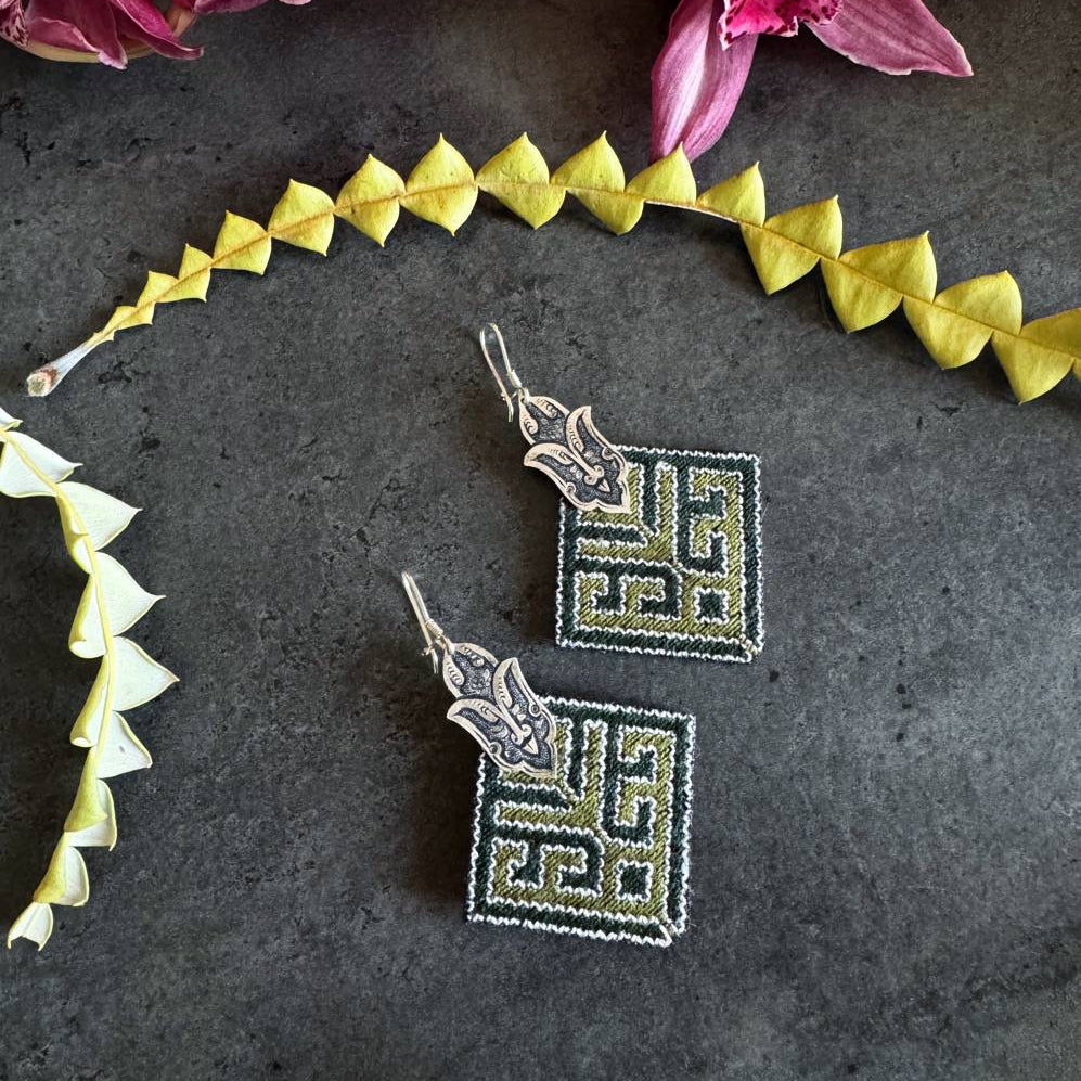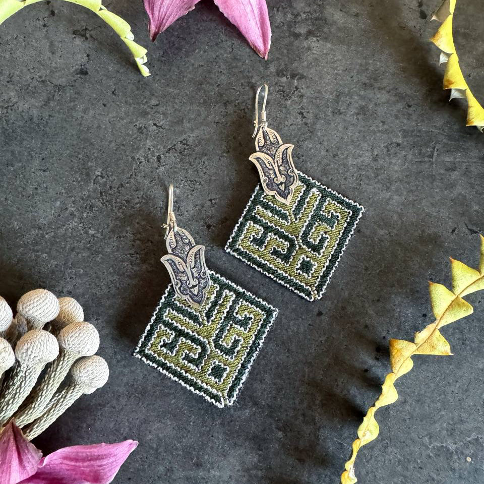 A handcrafted statement earring that brings together silk embroidery and traditional hand-engraved silver. Carefully stitched with fine silk threads in layered shades of deep and light green, the embroidery creates a rich, dimensional texture. The silver elements are meticulously hand-engraved, featuring an abstract interpretation of the iconic tulip motif — a symbol of heritage and elegance. Each piece is individually sewn and engraved by hand, celebrating the dialogue between intricate textile craftsmanship and timeless metal artistry.